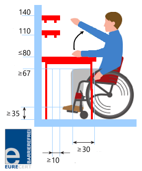 Um auch im Sitzen gute Greif- und Bedienbereiche zu erzeugen (etwa in der Küche, dem Bad oder im Arbeitszimmer) ist eine teilweise oder vollständige Unterfahrbarkeit zu gewährleisten. Erfahrungsgemäß ist eine solche Unterfahrbarkeit ab einer Höhe größer 67cm Tischhöhe gegeben.