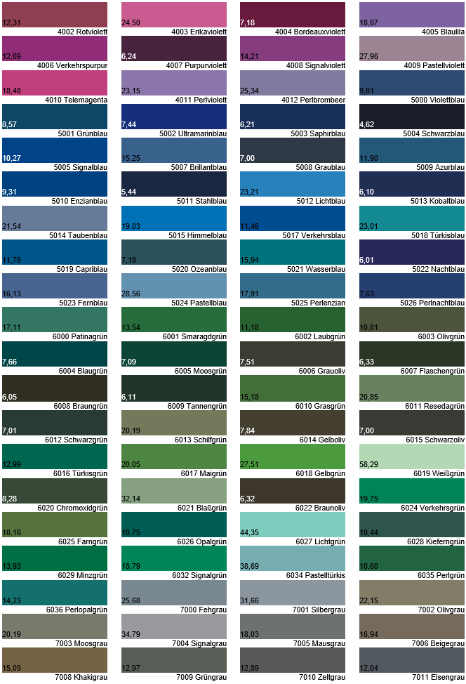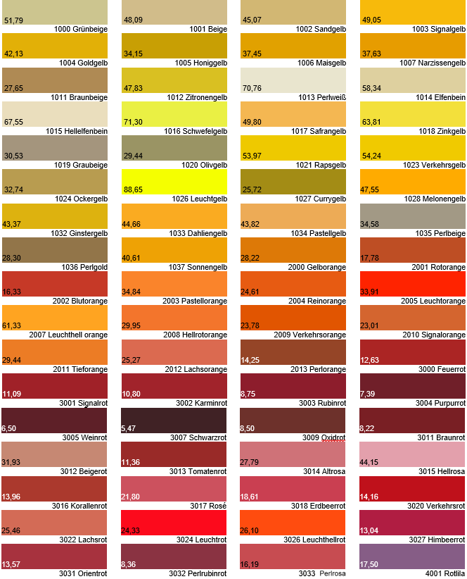 Die RAL-Farben, des RAL (Deutsches Institut für Gütesicherung und Kennzeichnung e.V.) werden in der gesamten Geschäftswelt eingesetzt; die Farben wurden von RAL eindeutig nummeriert und benannt. Durch die Zuteilung der Farbnummern werden Missverständnisse vermieden. Die Farben aus der RAL Classic K7 Farbpalette haben wir ergänzt durch die passenden Hellbezugswerte Y und sie hier für Sie abgebildet. Jetzt können Sie durch Errechnen des Kontrastes schnell herausfinden, ob Ihre gewünschte Farbkombination auch kontrastreich genug ist. Bitte beachten Sie, dass die Anzeige von Farben im Print oder Digitalbereich niemals farbverbindlich ist.