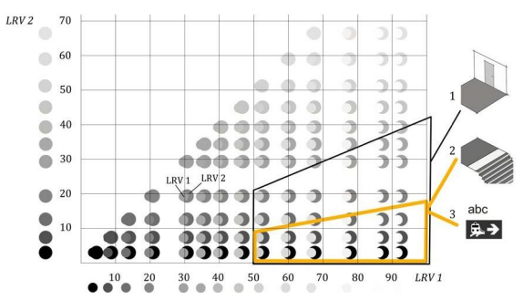 Mit der vorliegenden Richtlinie EU-GS 904 haben wir als Gebrauchswerte für Markierungen am Boden (z.B. Treppen oder Bodenindikatoren einen Kontrast von K ≥ 0,5 und für Beschriftungen und Markierungen auf transparenten Flächen (z.B. Glas) oder Schwarz/Weiß Darstellungen einen Kontrast von K ≥ 0,8 zwingend festgelegt. Generell gilt, dass die hellere der kontrastierenden Flächen einen Reflexionsgrad von ρ ≥ 0,5 (also ca. einen Hellbezugswert von 50) aufweist*.